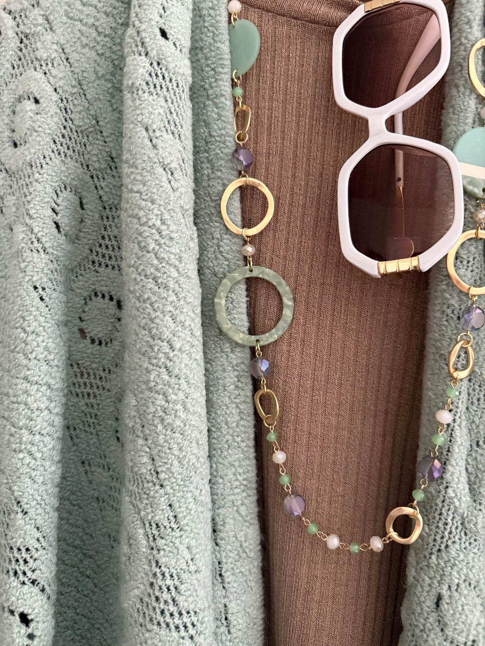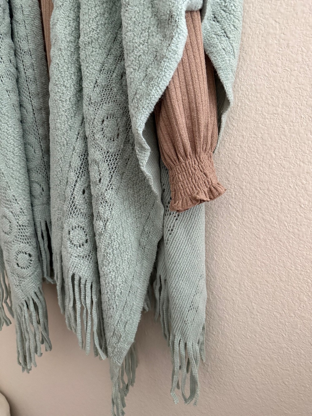 Boho vibe texture on this crochet sea glass-colored wrap with fringe edge